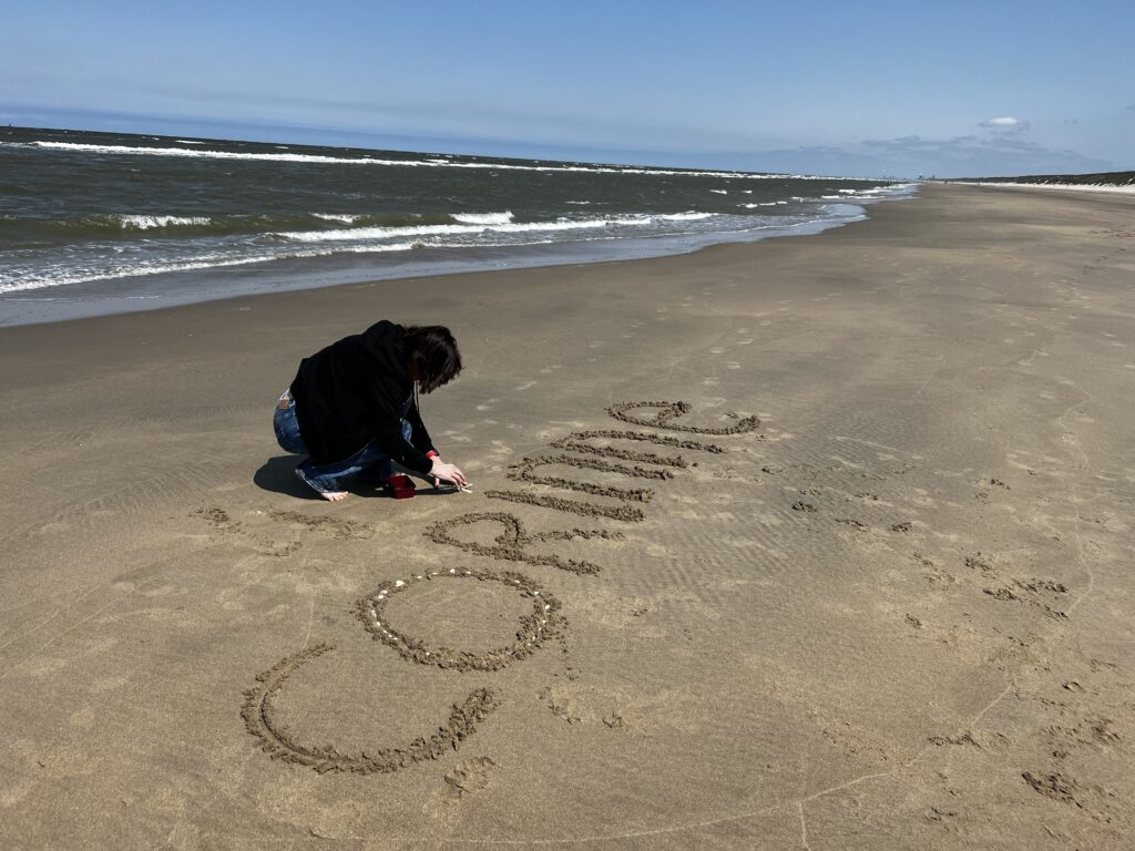 Op de dag van haar ritueel schijnt de zon uitbundig. Na het verzamelen van schelpen en het zoeken naar de juiste plek op het strand, schrijft Corinne haar naam in het zand. Ze begint met kleine letters, ze vindt het spannend om zo zichtbaar te worden. Nadat ik een paar keer ‘nog groter’ tegen haar heb gezegd, verschijnt haar naam groot in het natte zand. Zo is ze zichtbaar, wordt ze gezien in het volle zonlicht. De letter O versiert ze met de gevonden schelpen, een oneindige cirkel.